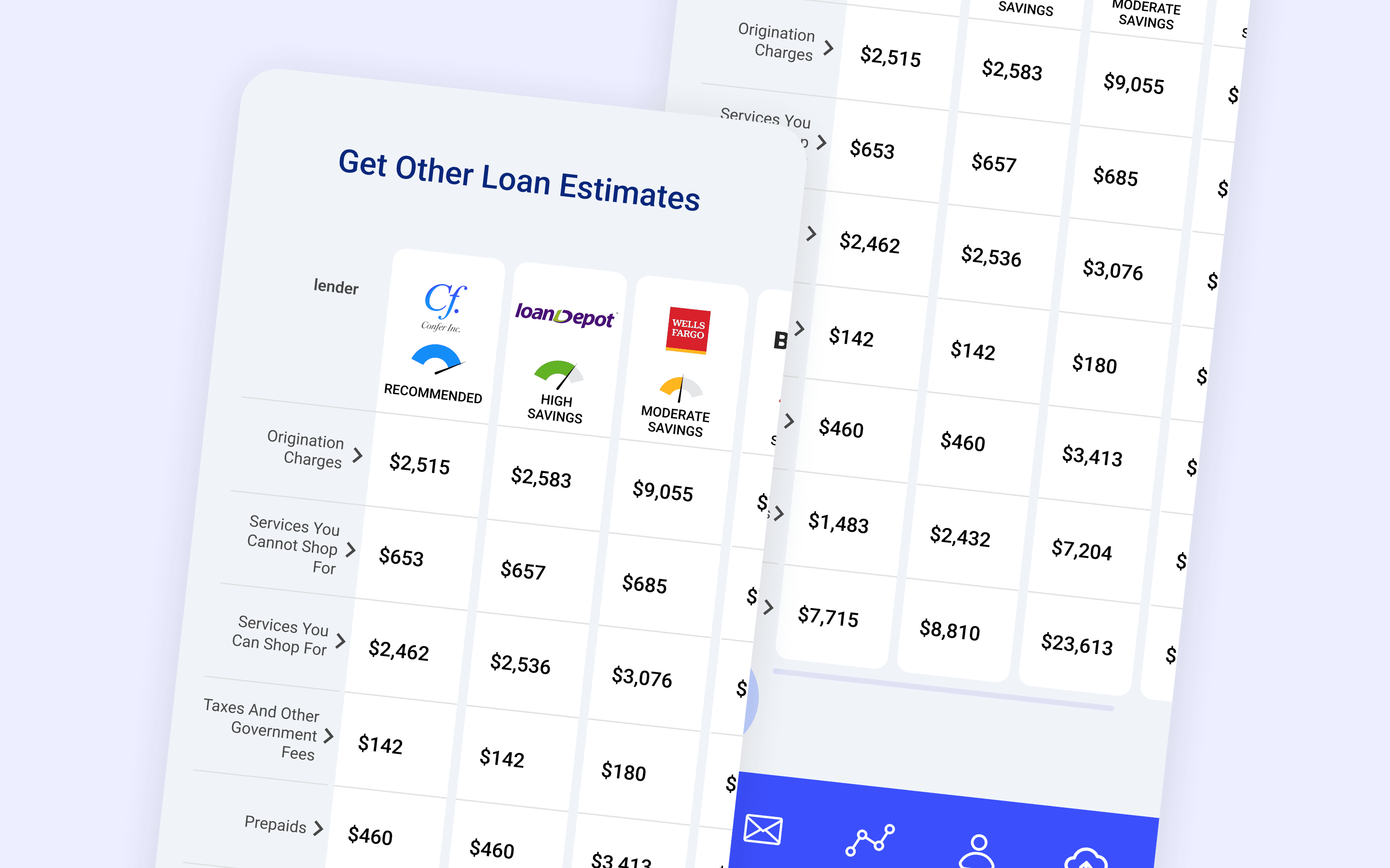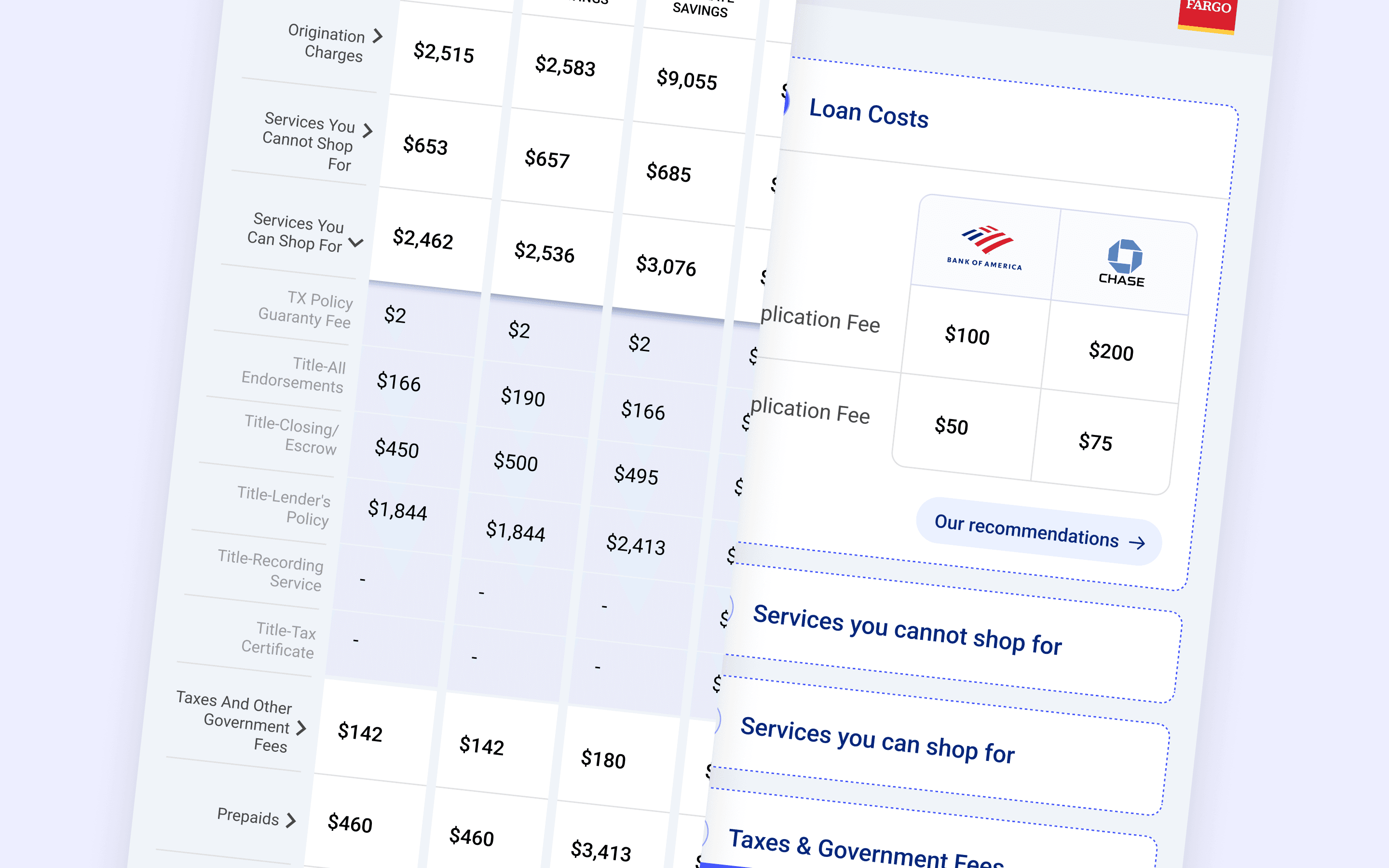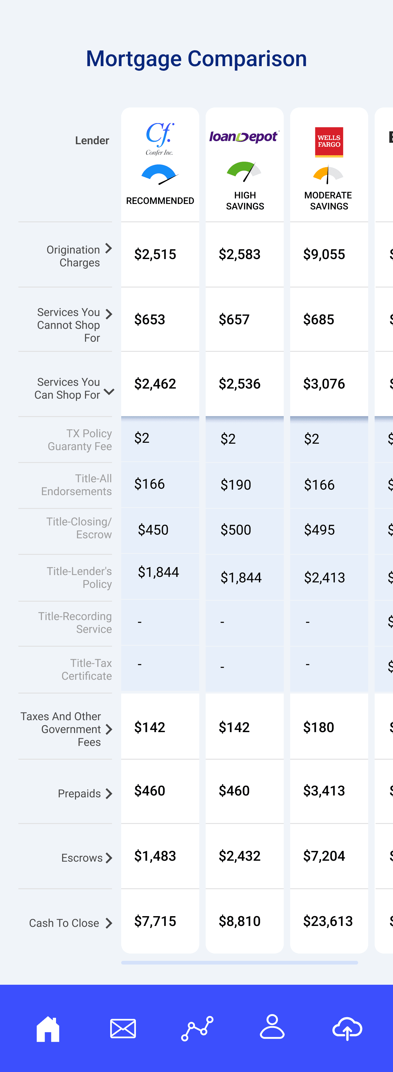 Each loan estimate has 15+ financial jargon line items. No standardized way to compare them, especially on mobile.